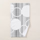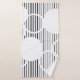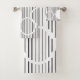 Cet ensemble de serviettes a un design moderne du milieu du siècle de lignes verticales noires avec des cercles blancs sur le dessus.