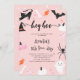 Carte d'invitation à la fête d'anniversaire de la fille à thème halloween mignonne avec illustration d'un fantôme, chat noir, araignée, chauve-souris, bonbons et citrouilles. Le texte dit : "Hé oui."