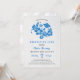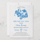 Invitation Festive et tendance Graduation Party parfait pour un événement Luau ou été. Le design comporte un motif avec hibiscus, feuilles, feuilles de palmiers et une casquette de graduation avec un motif de parties scintillant bleu. L'arrière - plan a une texture bois blanc doux pour une touche rustique.