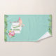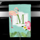 Une serviette de main tropicale charmante présentant un flamant rose, des frondes de palmier luxuriantes et des fleurs d'hibiscus et de plumeria roses entourant une initiale monogramme personnalisée dans un cadre élégant. Le fond bleu frais de l'œuf de merle crée un look aéré et inspiré de l'île. Un accent charmant pour les salles de bains de maison de plage, les poudrières ou la décoration sur le thème tropical. L'initiale est entièrement personnalisable. Coordonne avec d'autres pièces de la collection flamant.
