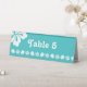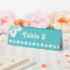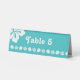 Ce panneau de tente de table à thème tropical présente un arrière - plan turquoise clair orné d'une bande de fleurs blanches d'hibiscus et de silhouettes de feuilles tropicales le long du fond et d'un seul hibiscus dans le coin supérieur. Il reste beaucoup d'espace au-dessus de la bande inférieure pour que vous puissiez remplir le numéro de la table ou d'autres informations, afin que les places assises puissent se dérouler plus facilement à votre mariage d'été. Ne manquez pas de visiter la collection complète de l'Hibiscus tropical en turquoise pour trouver d'autres produits, y compris des invitations, des livres d'hôtes, des serviettes et même des ballotins, avec des designs assortis qui permettront de coordonner véritablement un mariage ou un événement spécial.