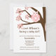 Il y a un bébé sur le chemin et ne peut pas attendre pour célébrer ! Cette invitation est adorable. Elle a un arrière - plan blanc solide. Le centre est blanc où vous personnalisez avec l'information de baby shower. Il y a un arbre dans le coin avec lui est des branches fleurissant avec de petits coeurs roses. Il y a un hibou rose adorable dans l'arbre.