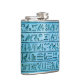 Un magnifique flacon de liqueur avec des lignes d'hiéroglyphes anciens gravés sur pierre en bleu.