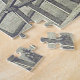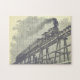 This vintage style puzzle design features a depiction of an old fashioned locomotive and train on a rail bridge.
