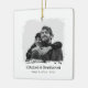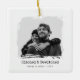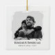 Un ornement en céramique carré chic avec une vitrine photo peinte à la brosse et une légende "Hitched & Bewitched" audacieuse. Ajoutez vos noms et votre année en dessous pour marquer le moment. Le look noir et blanc épuré flatte les portraits mariages ou fiançailles et se marie avec n'importe quel arbre ou emballage cadeau. Parfait pour les jeunes mariés, les anniversaires ou un gardien romantique à exposer sur un stand toute la saison.
