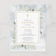 Doté de délicats feuilles de verdure aquarelée sur un arrière - plan de gel hivernal et d'un élégant crucifix en or, ce baptême ou invitation à baptiser chic neutre genre peut être personnalisé avec vos informations spéciales, avec un arrière - plan de sauge argent au verso. Conçu par Thisisnotme©