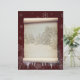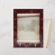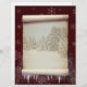 Winter parchment illustration featuring old paper scroll with a snowy landscape and decorated with snow and icicles on a dark red background with snowflakes.