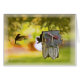 Cette carte présente une photo colorée d'une maison sur le point d'atterrir sur son château d'oiseaux.