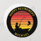 Silhouette d'un homme dans un bateau de pêche et attraper un gros poisson basse silhouette contre un coucher de soleil de style rétro. Vous pouvez customiser les couleurs et personnaliser le texte "Happy Retirement Michael" avec ce modèle.
