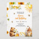 Un doux thème d'anniversaire avec des abeilles, un ours bébé, une ruche, des petits oiseaux et des fleurs jaunes à l'avant et de jolis tournesols à l'arrière ! Vous pouvez personnaliser cette invitation avec vos propres détails.