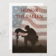 Honore les morts avec un dernier salut. En l'honneur de nos membres déchus des forces armées. Le soldat s'agenouille devant la tombe de son camarade déchu. Dans l'arrière - plan le drapeau des Etats-Unis.