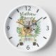 Wild One Safari Woodland Forest Cute Animaux dans une voiture Horloge. Lion bébé, éléphant, girafe, zèbre, tortilla. Ajoutez simplement votre nom.