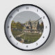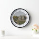 Cette horloge présente une oeuvre d'art numérique originale de Jayne Wilson, représentant un grand chalet au bord du lac entouré d'arbres dans leur feuillage d'automne, avec un sentier menant à un bateau au bord de l'eau.