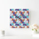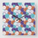 A square wall clock with overlapping clock faces in orange, purple, and teal patterns, featuring black hour and minute hands in the center. The design gives a vibrant, busy feel.