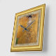 Horloge murale vintage présentant la célèbre œuvre d'art "Adele - la Dame en or" de Gustav Klimt encadrée dans un cadre doré souligné d'un fond en toile de lin rustique décoratif ancien.