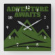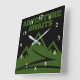 Adventure awaits mountain peak hiking trail Square Wall Clock. Custom wall clock with numbers and inspirational nature quote. Black and green or custom colors. Cool decor for home, office, shop, business, cabin and more. Fun Birthday vend idea for friends, family, coworker, hunter, hiker, camper, etc.