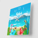 A tropical, Hawaiian beach with blue and red Hibiscus flowers, palm leaves, a flamingo and a blue and yellow parrot. A coconut on the sandy beach, blue ocean with waves and the blue sky. White text: Aloha.