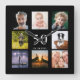 Une horloge murale en cadeau pour un 50ème anniversaire (ou tout âge) pour un gars, célébrant sa vie avec un collage de 8 de vos propres photos. Personnalisez et ajoutez l'âge de 50 ans et une date. Date de naissance ou date d'anniversaire. Lettres de couleur blanche. Arrière - plan noir.