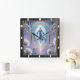 Cette horloge murale carré présente une figure mystique en robes bleues coulantes qui montent à travers une arcade ornée et joliment décorée, entourée d'une brillante et délicate bulle. Des roses blanches luxuriantes encadrent la scène, dressées contre un ciel doux et éthérée, évoquant un sentiment de transcendance spirituelle et de beauté sereine.