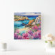 "Arches Au Bord De La Mer". Une vue idyllique sur une belle baie, avec un seul bateau. Une petite plage de sable est encadrée par une belle mer azurée et des fleurs roses et violettes.