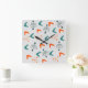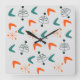 Cette horloge murale a un design moderne atomique du milieu du siècle de formes boomerang, antennes, et starbursts en turquoise, orange.