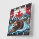 Un castor construit un barrage dans une rivière vibrante, sur fond de drapeau canadien et de paysage montagneux.