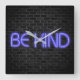 Mur de brique urbaine éclairé avec texte BE KIND dans des lumières de néon violet brillant.