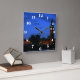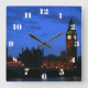A reminder of London, this clock face has a view across the River Thames of Big Ben and the Houses of Parliament at nightfall, against a bright blue evening sky, with the lights of the clock shining out. The clock has white numbers.