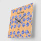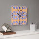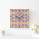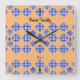 Horloge design en forme de diamant bleu et blanc à damiers avec arrière - plan beige. Deux emplacements pour la personnalisation du texte. Un cadeau tout simplement personnalisé, peint d'art pour la cuisine. Partie de la Collection Pléthore de Motifs.