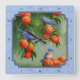 Deux bleuets de l'ouest perchent dans un pêcher tandis qu'un troisième bleu est assis sur un panier en bois tressé rempli de fruits frais récoltés prêts à être commercialisés. Accentué par un arrière - plan à motifs bleus assorti.