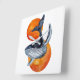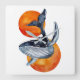 decorative artwork of a blue whale swimming along in front of two golden surreal balls on wall clock.