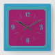 Une horloge atmosphérique simple avec une bordure bleu-vert et un centre cerise. De grands chiffres vert aquatique complètent ce design élégant. Disponible uniquement en forme carrée.