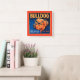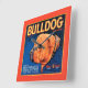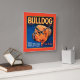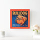 Un imprimé de étiquette vintage en caisse illustrant un bulldog avec un arrière - plan à motifs bleus et une bordure orange. Choisissez cette impression d'art sur votre produit Zazzle aujourd'hui.