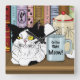 Un chat en tuxedo noir et blanc se réveille sur un plateau de cuisine avec ses livres de cuisine, tasse à café, sucre et crème.