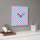 A vibrant checkerboard pattern featuring alternating pastel purple, pink, and green squares against a white background, creating a playful, colorful effect.