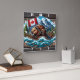 Un castor canadien est assis sur un radeau en bâtons, entouré d'eau et de montagnes, avec un drapeau agitant dans l'arrière - plan.