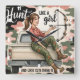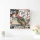 Cette horloge murale carré amusante présente une chasseur souriante en camouflage, assise en toute confiance sur la hayon d'un pick-up blanc, tenant un arc et une flèche. Le texte ludique "Hunt Like a Girl AND Look Cute Doing It" ajoute une touche humoristique et stimulante à cette pièce unique.