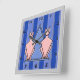 Cette conception classique d'horloge à chat Art déco est réinventée par l'artiste numérique Leslie Sigal Javorek. Sur un fond rayé (bleu royal, bleuet et argent) ayant l'apparence d'un cuir fin, se trouve un médaillon central représentant une paire de chats géométriques égyptiens roses encadrant une pyramide bleue qui imite l'aspect du Bakélite (un des premiers plastiques).
