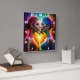 Deux personnages stylisés avec des marques vibrantes se font face, entourés de couleurs éclatantes et de motifs lumineux dynamiques, créant un effet visuel saisissant.