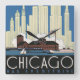 Illustration vintage d'affiche de voyage de Chicago, Illinois, Chicago a tout ! Avec une vue sur l'horizon de la ville de Chicago, avec des gratte-ciel, des bâtiments hauts et le port avec des navires et d'autres bateaux.