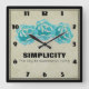 A clock with an source d'inspiration which says: Simplicity the key to successful living. Illustrated with teal watercolor roses on a faded tan damask .