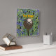 Thé Time ! Golf atop a tee, sits against a background of green, blue, yellow and purple dots. Des marques de chiffres et de minutes.