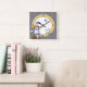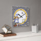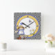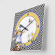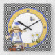Whimsical wall clock of a cute little girl garden, with little blue bird on her head. A black and white checkerboard frame around the outside of the clock, with a colorful blue, white, and yellow circulaire middle decorated with polka dots, flowers, and a butterfly, with blue and yellow ladybugs in place of the hours 12, 3, 6 et 9 o'clock. Customize to add text to this colorful fun clock great for any room of the house.
