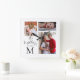 Sur cette horloge murale carré élégant est une lettre monogramme dans le coin puis 3 photos avec le texte sur le côté avec le nom de famille et la date où vous pouvez customiser à votre goût avec vos propres photos et nom de famille.