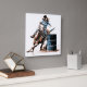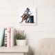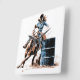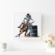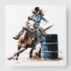 Image graphique de style pop art en marron, bleu et noir d'une fille qui court avec son cheval autour d'un tonneau avec ses cheveux volant. Personnalisable .