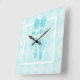 A cute 's a boy' birth announcement clock with a trendy blue argyle pattern background, embellished with sweet little baby footprints and a pastel ribbon tied into a bow. Personnalize by adding your new baby's name to the clock front that has white roman numerque.