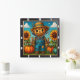 Cette charmante horloge murale carré présente un épouvantail sympathique et souriant dans des salons bleus et un casquette en paille, debout dans un champ d'automne vibrant. Flanqué par de grands tournesols et des citrouilles oranges et turquoises, contre un ciel bleu clair, ce design reflète l'esprit joyeux de la saison des récoltes.