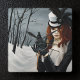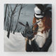 Femme de Steampunk avec les cheveux rouges sur une promenade d'hiver libérant son messager de libellule avec une clé