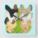 Six belles poules d'Uccle sont montrées ici : brun rouge, bleu mille fleur, blanc, bleu, buff Colombien et col doré.