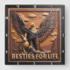 This highly dimensional square wall clock features a close-up illustration of a brown eagle with a determined expression and a white, smiling rabbit sitting closely together. The entire design is rendered in muted brown, tan, and dark leather-like tones, strongly suggesting a deep sculpted relief or Sculpted Leather Look. The eagle is perched on the left, displaying detailed feathers, while the rabbit is on the right, appearing cheerful with long ears and textured fur. They are framed by a prominent, circular wreath of stylized leaves and branches carved into the perimeter. The background features detailed rocky terrain and stylized trees. The large, three-dimensional embossed text "BESTIES FOR LIFE" is carved across the top center in a bold, golden serif font. The clock face features a simple clock face border with large, white, numbered tick marks (1 to 12) integrated into the outer frame. The artwork is surrounded by a thick, dark brown decorative border that resembles a black wood frame.